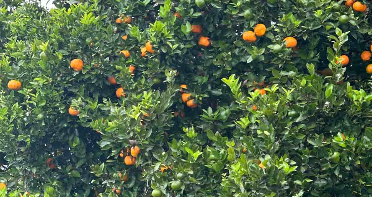 Árboles frutales maduros y otros recientemente sembrados distribuidos en la propiedad